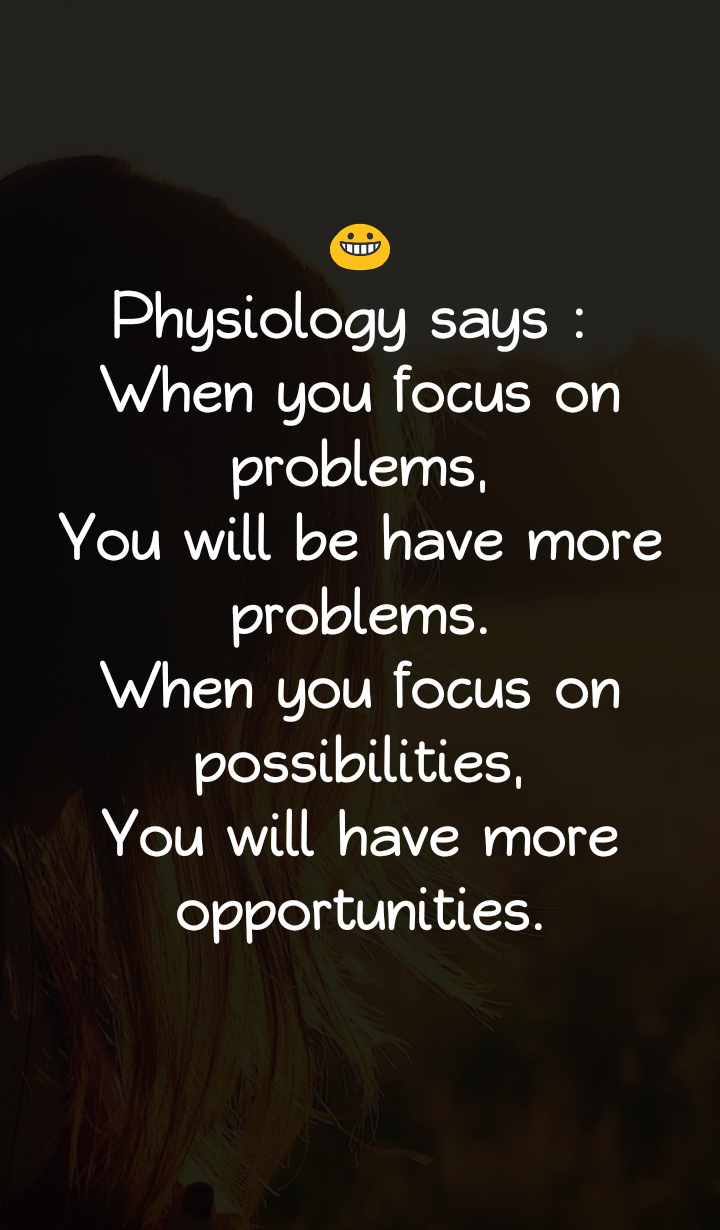 | Physiology says: When you focus on problems, You will be have more problems. When you focus on possibilities, You will have more opportunities. |